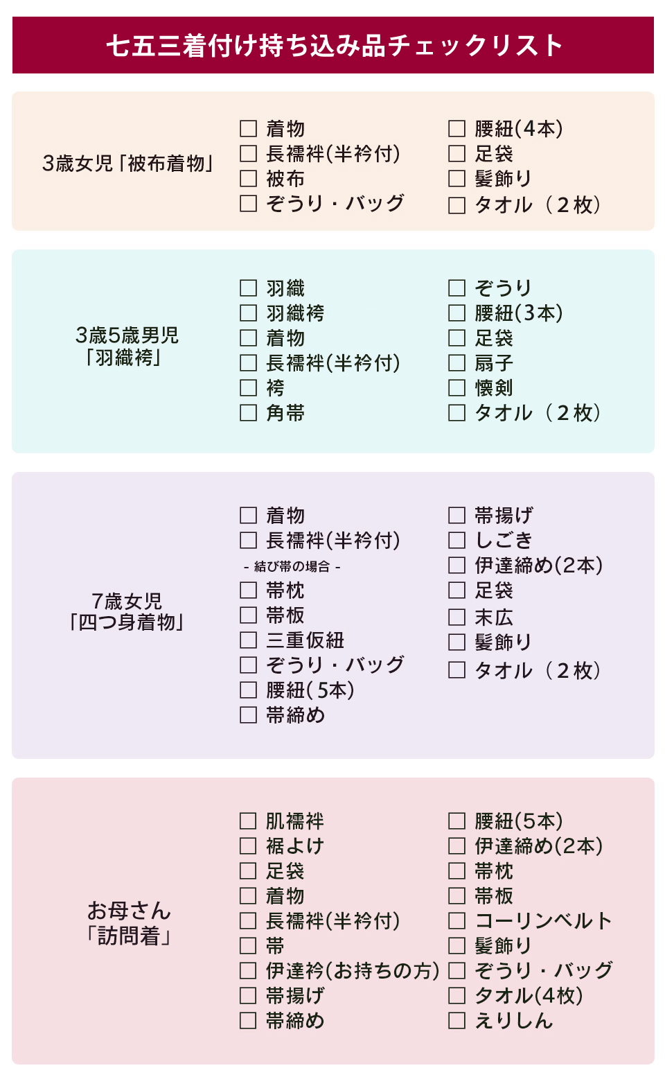 足袋 / 草履・バッグ / 長襦袢(半衿をつける) / 着物 / 帯 / 帯板 / 帯枕 / 裾除け・肌着(又はワンピース型) / 帯揚げ / 腰ひも 4本 / 伊達締め 2本 / 衿芯 / タオル 5枚 /帯締め / コーリンベルト / 三重ゴムひも /